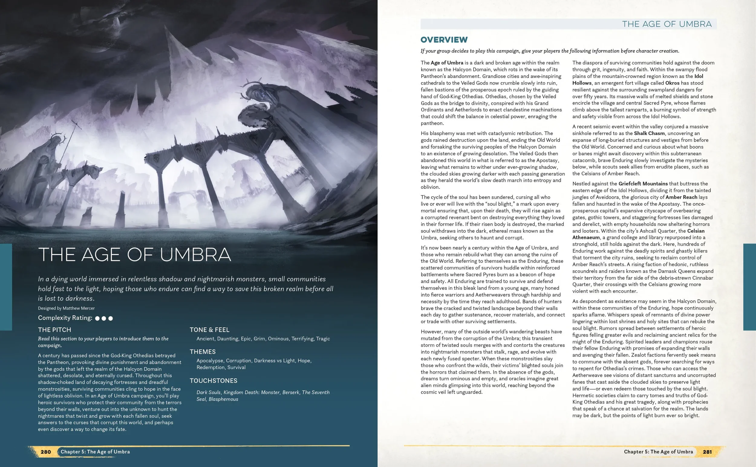 Age of Umbra is an eight-part dark, survival fantasy used with the Daggerheart table-top game system. The Age of Umbra show is meant to stand out from Critical Role’s typical high-fantasy d&d gameplay and campaigns— branding direction aimed to capture the feel of "ancient, daunting, grim, ominous, terrifying, and tragic," with themes of "apocalypse, corruption, darkness vs. light, hope, redemption, and survival."